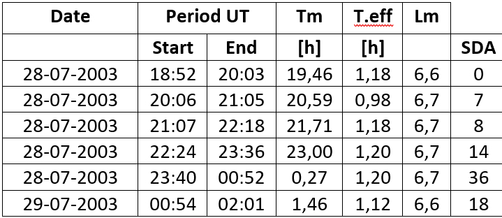 Table 5. Data from the author from the night of July 28/29, 2003.