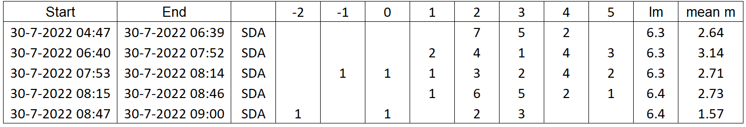 Table 8. Magnitude distribution of SDAs on July 29, 2022, as observed by Terrence Ross.
