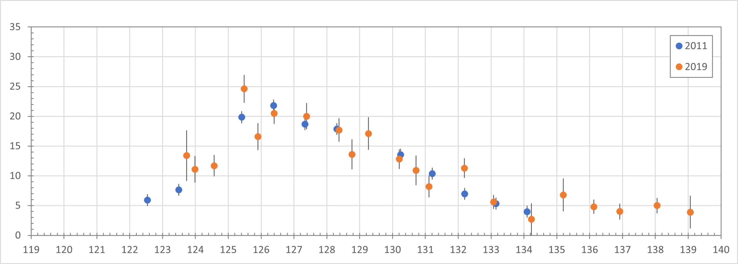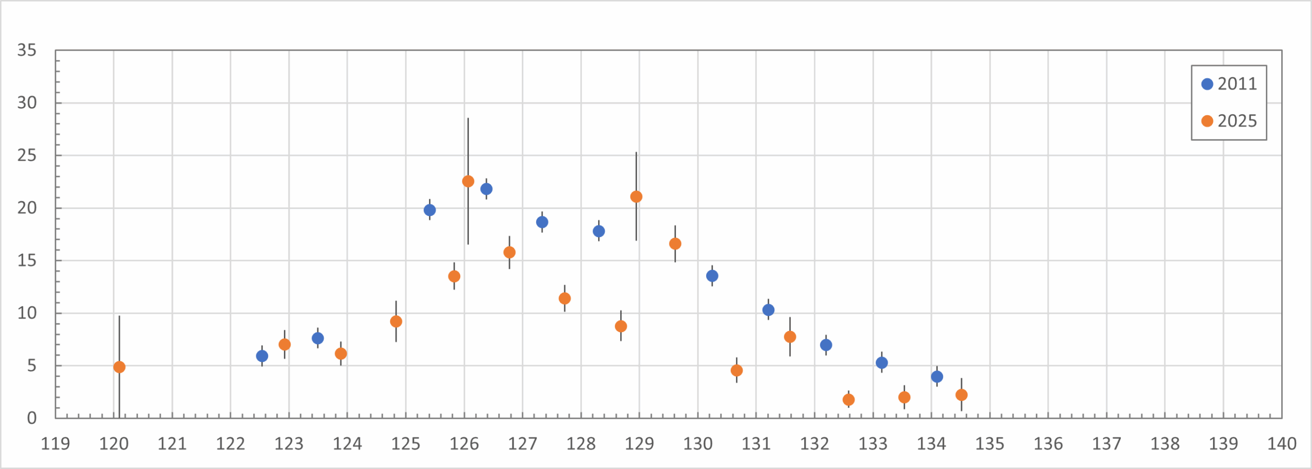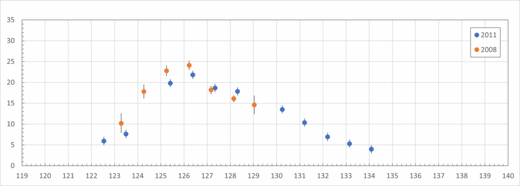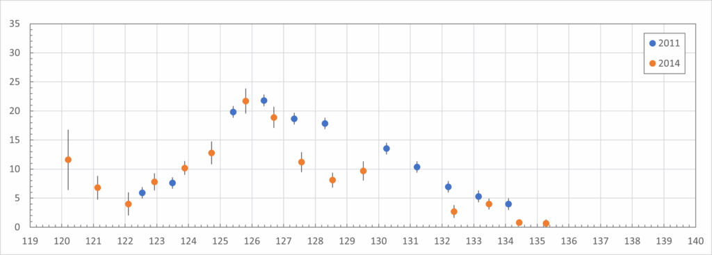 Two things stand out when comparing 2025 with 2011. Almost the entire 2025 graph is 30 to 40% lower in activity than 2011. Before this analysis began, Thomas Weiland, observing from Crete, reported seeing roughly 30% fewer SDAs compared to previous observations from that location. What is higher than the 2011 graph are the two points at λꙨ = 129.0 and 129.6. These may also indicate increased SDA activity. This will be discussed in the next chapter.