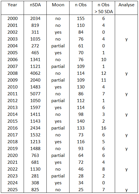 Besides the well-known Perseid maximum around August 12th, late July is also a good time to observe meteors. Besides the existing Perseid activity, many minor meteor showers are active: the Capricornids, the Aquariids complex, the gamma Draconids, and the Pisces Austrinids. Sporadic activity also increases significantly throughout July. All of this combined often results in high meteor activity. Most of the activity at the end of July comes from the Southern delta Aquariids (SDA). The SDAs are medium-speed meteors that are usually faint, although an occasional fireball is possible. DMS observers have often undertaken visual expeditions to better understand the meteor shower. The first good DMS data came from the first international expedition in 1984 in Puimichel, southern France. But especially the later expeditions to La Palma in 2008 [1, 2, 3] and Namibia in 2011 [4, 5, 6] yielded a wealth of visual data. Since those expeditions, the SDAs have been regularly observed from southern locations, resulting in analyses of the SDA’s based on IMO data. In 2025, the author conducted a study with two objectives: is there a trend in annual SDA activity and does the meteorshower sometimes show increased activity?