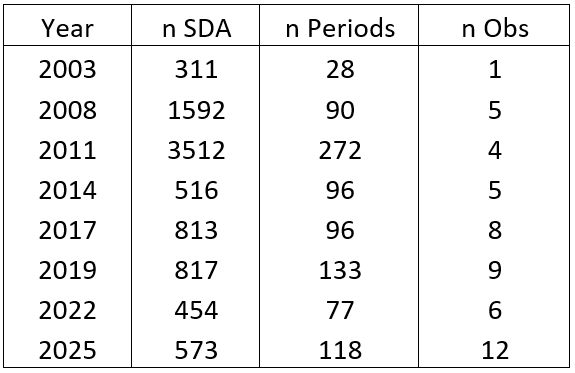 Table 3: overview of numbers of SDA’s, periods and observers used for this analysis.