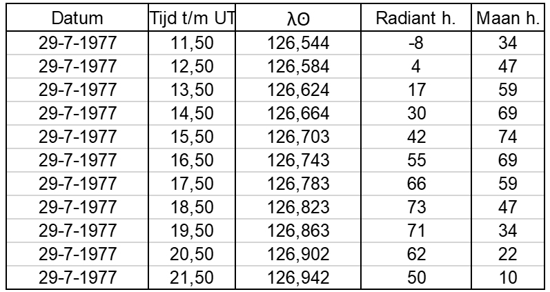 Unfortunately, the data is no longer available via J. Wood or G. Kronk. Furthermore, the moon was nearly full on July 29, 1977. Observers observing under moonlight conditions often tend to underestimate the limiting magnitude, resulting in too high ZHR’s. On the other hand, Australia still has very dark and very dry locations, and the moon will have less of a negative influence on the limiting magnitude. To investigate whether overlap in solar longitude could be found during potentially increased activity in more recent years, the following research was conducted.