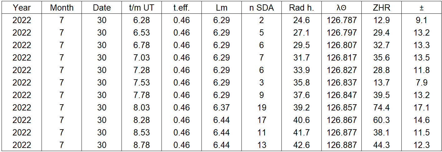 Table 7. The ZHR of the SDAs on July 29, 2022 as observed by Terrence Ross, Texas, US.