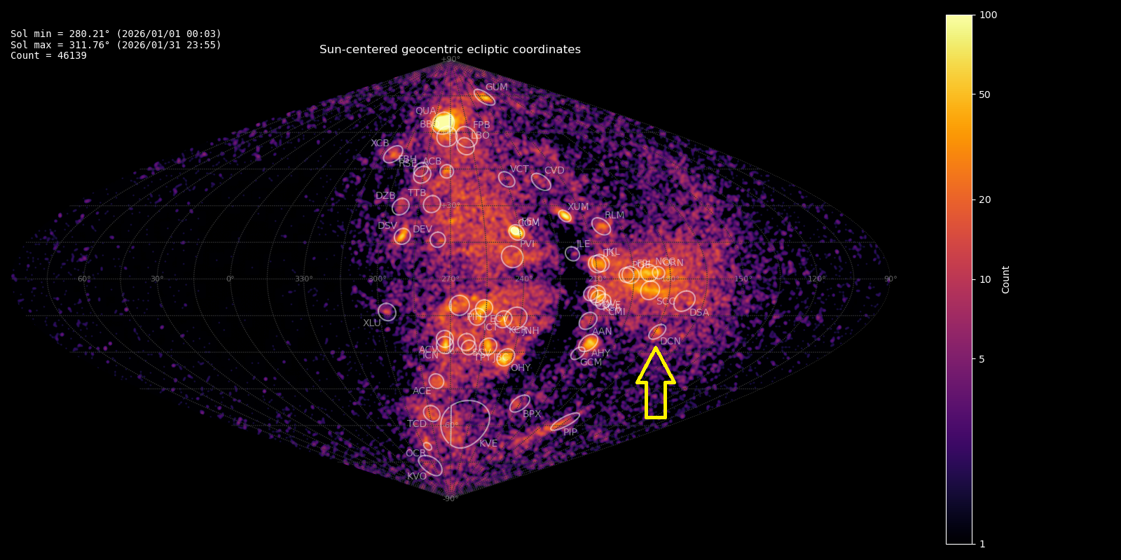 Figure 1 – Radiant density map with 46139 radiants obtained by the Global Meteor Network during January, 2026. The position of the delta1-Canis Minorid in Sun-centered geocentric ecliptic coordinates is marked with a yellow arrow.