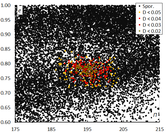 Figure 11 – Eccentricity e versus the longitude of perihelion Π color-coded for different classes of D-criteria thresholds, for λʘ between 287° and 300°. Spor. = sporadics.