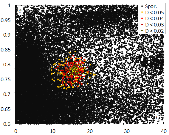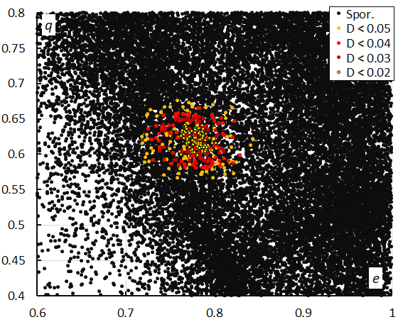 Figure 15 – Perihelion distance q versus the eccentricity e color-coded for different classes of D-criteria thresholds, for λʘ between 287° and 300°. Spor. = sporadics.