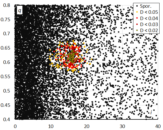 Figure 14 – Perihelion distance q versus the inclination i color-coded for different classes of D-criteria thresholds, for λʘ between 287° and 300°. Spor. = sporadics.
