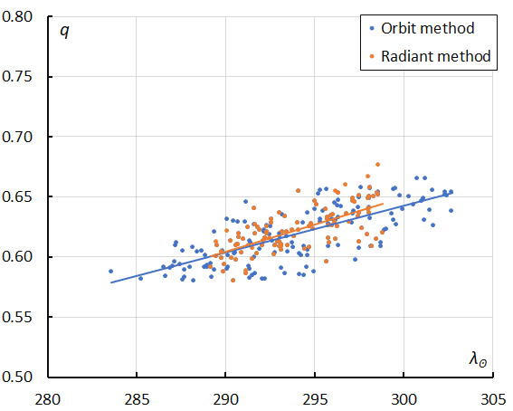 Figure 16 – The evolution of the perihelion distance q in function of the Solar Longitude λʘ based upon the radiant method (2025–2026) and upon the orbit method (2019–2026).