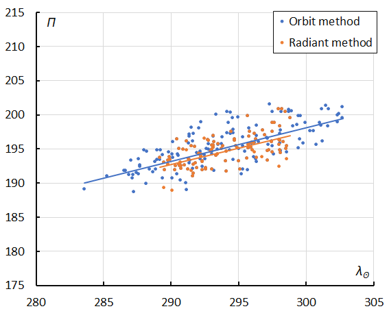 Figure 12 – The evolution of the Longitude of Perihelion Π in function of the Solar Longitude λʘ based upon the radiant method (2025–2026) and upon the orbit method (2019–2026).