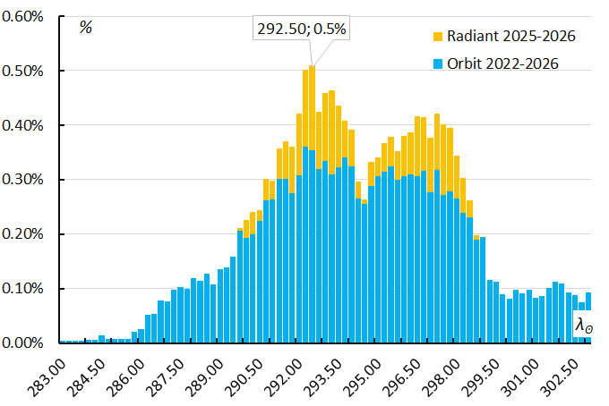 Table 2 – Comparing solutions obtained by the radiant method for 2025–2026, the orbit method 2019–2026 for DD < 0.04 and DD < 0.03, compared to the solution by Jenniskens (2023).