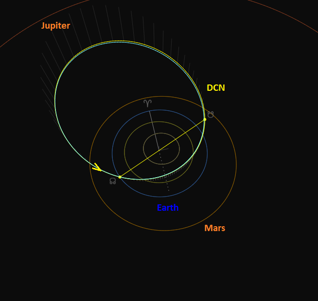 The Tisserand value relative to Jupiter with TJ = 2.73 is typical for a Jupiter-family cometary orbit. This may explain the 2026 outburst, relative to 2024 and 2025, as due to a close pass of the parent body to Jupiter at some unknown time in the past. The meteoroid stream crosses the ecliptic and Earth’s orbit at its ascending node (Figure 16). The solutions found with the radiant and orbit method are in agreement and confirm the orbit obtained by CAMS (Jenniskens, 2023). A search for candidate parent bodies did not result in any convincing associations (Table 3). A value of DD = 0.073 looks acceptable, but this type of orbit requires a better threshold with DD < 0.04 to be a likely parent body.