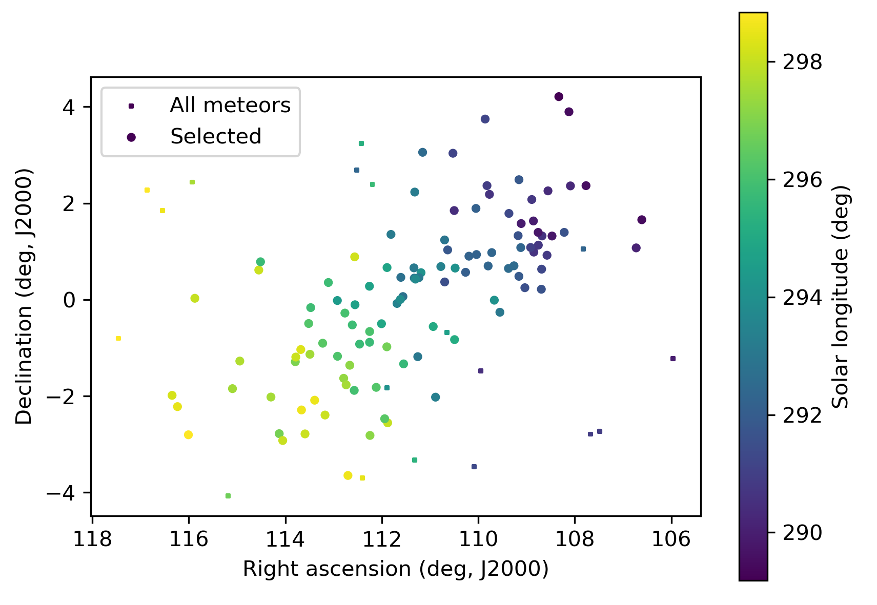 Figure 3 – The radiant distribution during the solar-longitude interval 291.5° – 298.5° in equatorial coordinates.