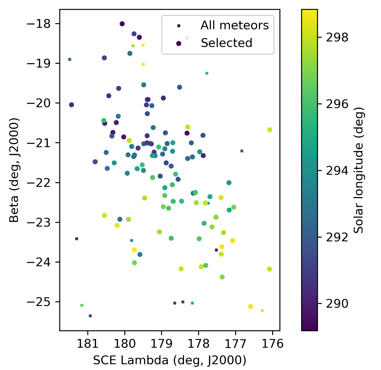 Figure 5 – The radiant distribution during the solar-longitude interval 291.5° – 298.5° in Sun centered geocentric ecliptic coordinates.