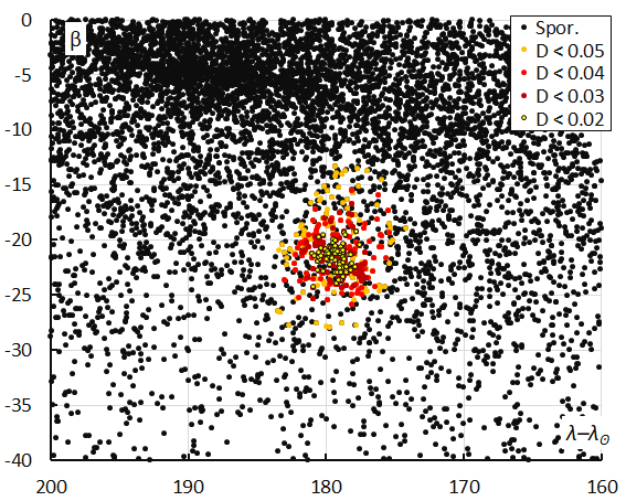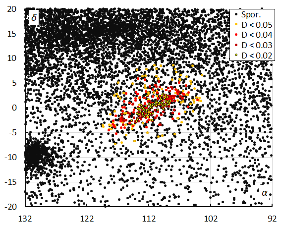 The radiant plot in equatorial coordinates (Figure 7) appears stretched due to the radiant drift caused by the movement of the Earth on its orbit around the Sun. The dense cluster east (left) from DCN are the alpha-Hydrids (AHY#331) an established minor shower. In Sun-centered ecliptic coordinates the radiant appears more concentrated (Figure 8). The orange dots with the threshold class DSH < 0.125 and DD < 0.05 and DJ < 0.125 appear very dispersed and represent outliers that are difficult to distinguish from the sporadic background. This threshold class appears to be too tolerant for this stream.