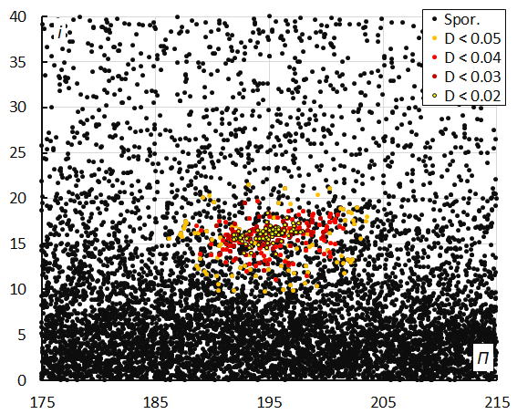 Figure 10 – Inclination i versus the longitude of perihelion Π color-coded for different classes of D-criteria thresholds, for λʘ between 287° and 300°. Spor. = sporadics.