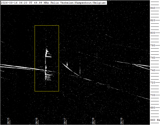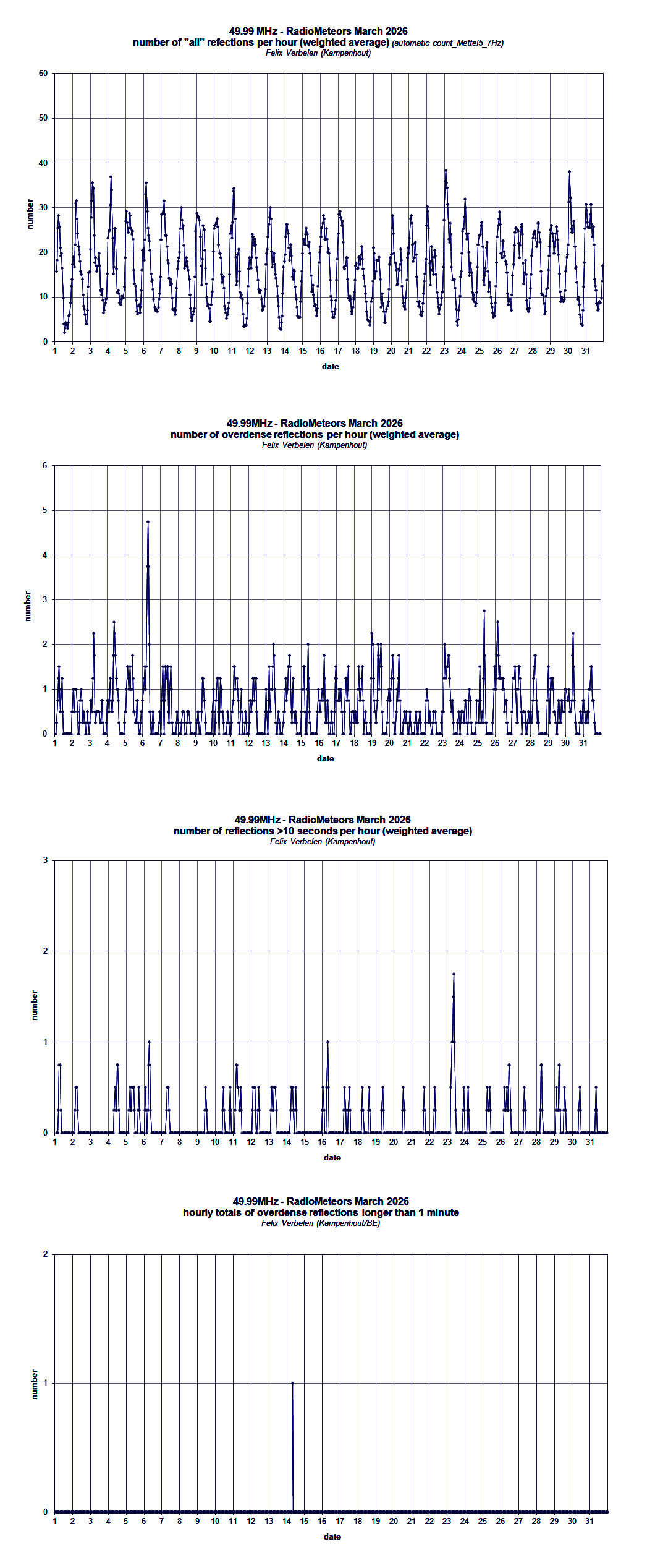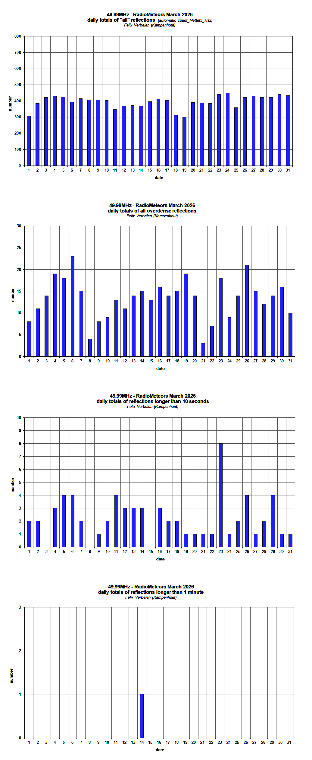 The graphs show both the daily totals (Figure 1) and the hourly numbers (Figure 2) of “all” reflections counted automatically, and of manually counted “overdense” reflections, overdense reflections longer than 10 seconds and longer than 1 minute, as observed here at Kampenhout (BE) on the frequency of our VVS-beacon (49.99 MHz) during the month of March 2026.