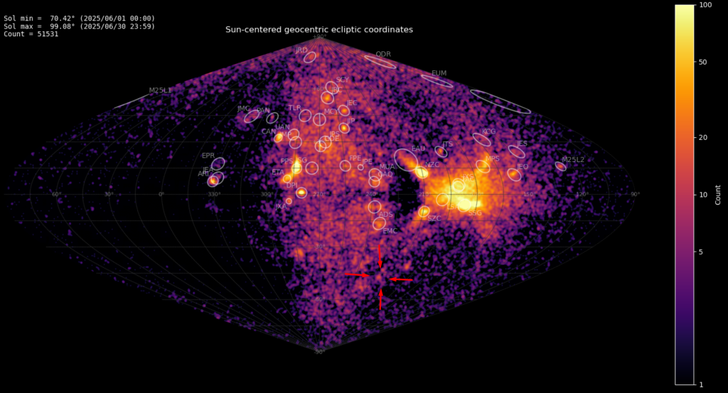 Figure 1 – Heat map with 51531 radiants obtained by the Global Meteor network in June 2025. A weak concentration is visible in Sun-centered geocentric ecliptic coordinates which was identified as a new meteor shower with the temporary identification M2025-O2.